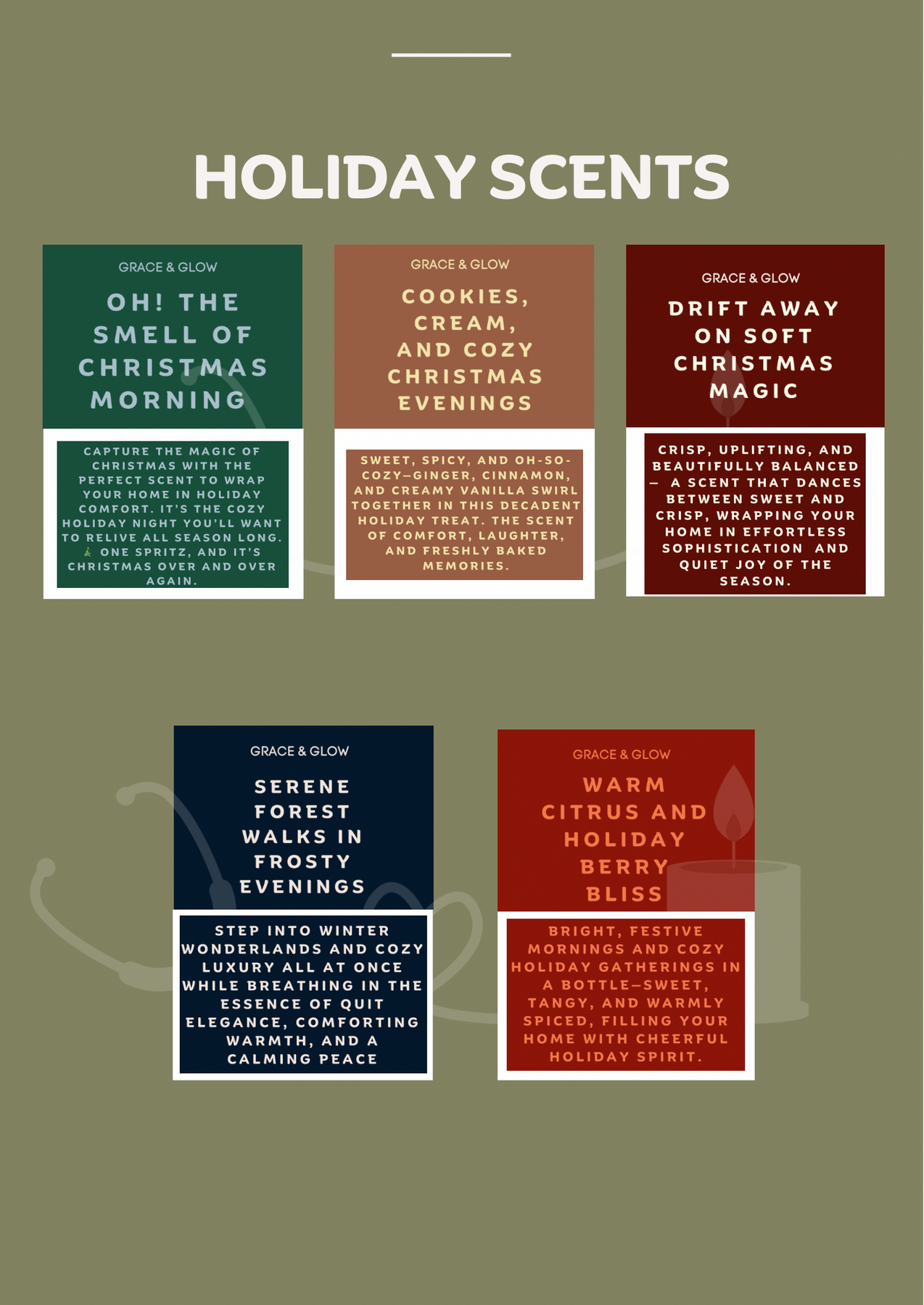 Experience the full spirit of the season — from crisp and refreshing to warm and cozy. Each scent captures holiday joy in its own way: bright mornings, festive gatherings, and comforting nights that make every spritz feel like Christmas all over again. 🎄